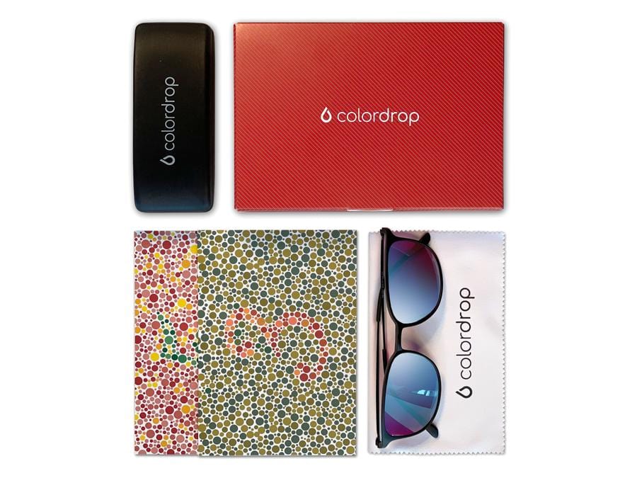 Prestamos atención a una calidad muy alta, no solo en nuestras gafas para daltónicos. Así es como se ve nuestro paquete estándar Colordrop. Está diseñado para recordar específicamente a un paquete de regalo, para celebrar la "magia del color" de manera adecuada.